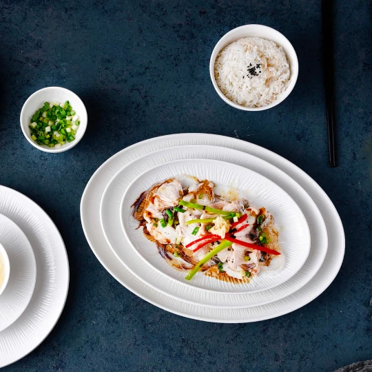 Modern and dynamic. The subtle engraved stripes bring movement and depth, ideal for contemporary Asian dining.